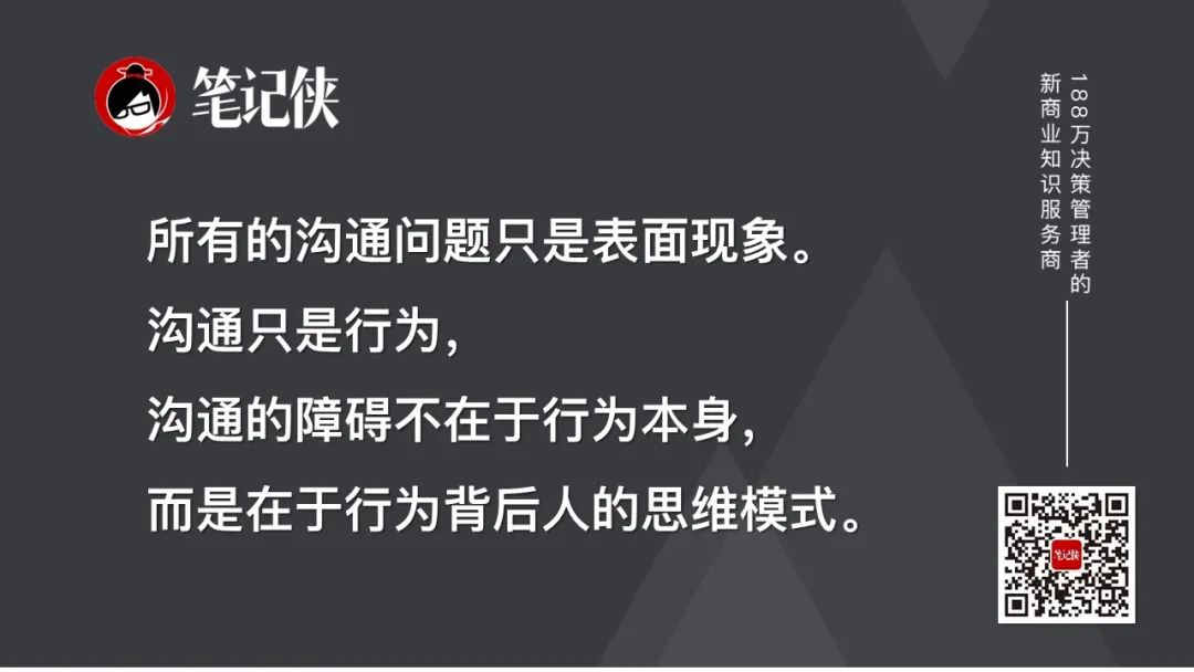 所有的沟通问题只是表面现象。沟通只是行为,沟通的障碍不在于行为本身,而是在于行为背后人的思维模式。