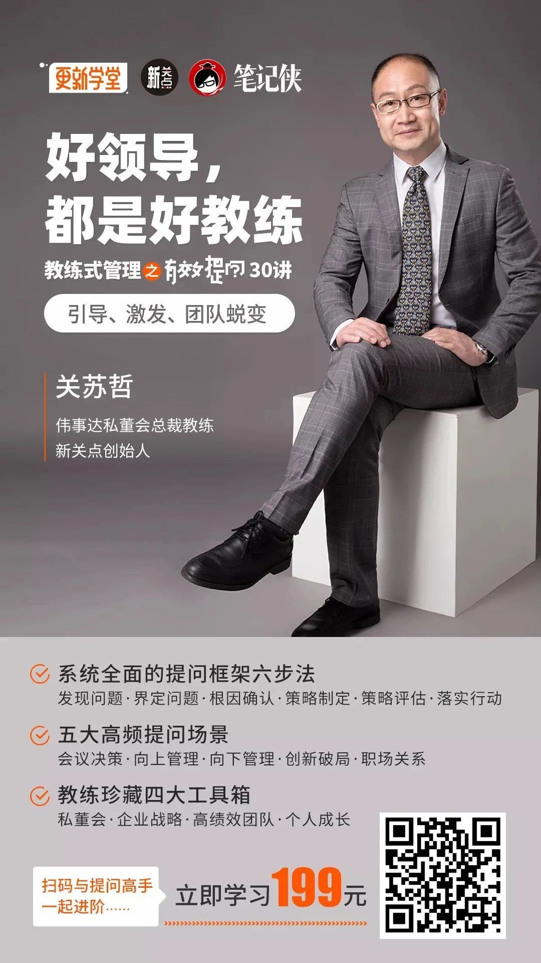 本课程中,关苏哲老师将分享自己多年来总结的方法论,从提问的底层逻辑入手,再到5大高频应用场景,最后提供4大珍藏工具箱,助你找出问题本质、和团队一起解决重大业务问题。